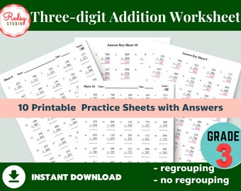 Three-digit Addition Worksheet 3rd-Grade, 10 Practice sheets with Answers, 3-digit addition, regrouping and no regrouping, math drills